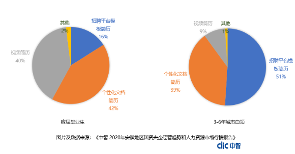 数据显示,42%的2020应届生求职会选择个性化的文档简历呈现给HR,40%的应届生求职选择视频简历更直接的展示自己的优势。相比之下,较传统的招聘平台模板简历,只有16%的应届生求职时选择使用。另一项数据显示,3-6年的城市白领求职者简历呈现方式选择传统的招聘平台模板简历,选择视频简历呈现的比例仅为9%。